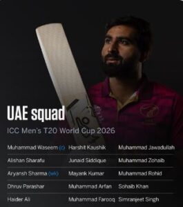 The United Arab Emirates (UAE) cricket team has officially announced its 15-member squad for the upcoming ICC Men’s T20 World Cup 2026, scheduled to begin on February 7, 2026 in India and Sri Lanka. This global tournament is the biggest event on the international T20 calendar, and for the UAE, it represents a major opportunity to shine on the world stage once again.